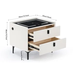 Optimisez votre espace chambre avec la Table de chevet intelligente Oyajia. Dotée d’un chargement sans fil 15W intégré et d’un port USB 10W, elle garde vos appareils chargés. Son éclairage LED personnalisable avec trois températures de couleur (blanc froid, lumière naturelle, jaune chaud) et gradation continue crée l’ambiance parfaite. Fabriquée avec un plateau en verre trempé de 8mm et un bois MDF épaissi, elle allie modernité et durabilité. Ses deux tiroirs offrent un rangement pratique.