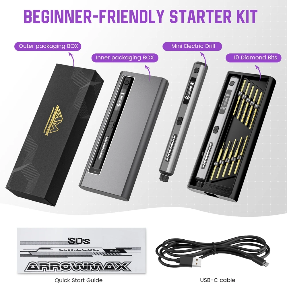 • Jeu de forets polyvalent : Livrée avec 10 forets (0,6 mm à 2,2 mm) en acier recouvert de titane, parfaits pour le bois, l’aluminium, le plastique et les circuits imprimés.