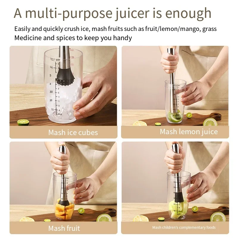 - Polyvalence : Idéal pour écraser des fruits, presser des jus, concasser de la glace, et préparer une variété de cocktails, y compris les Mojitos et les Caipirinhas.