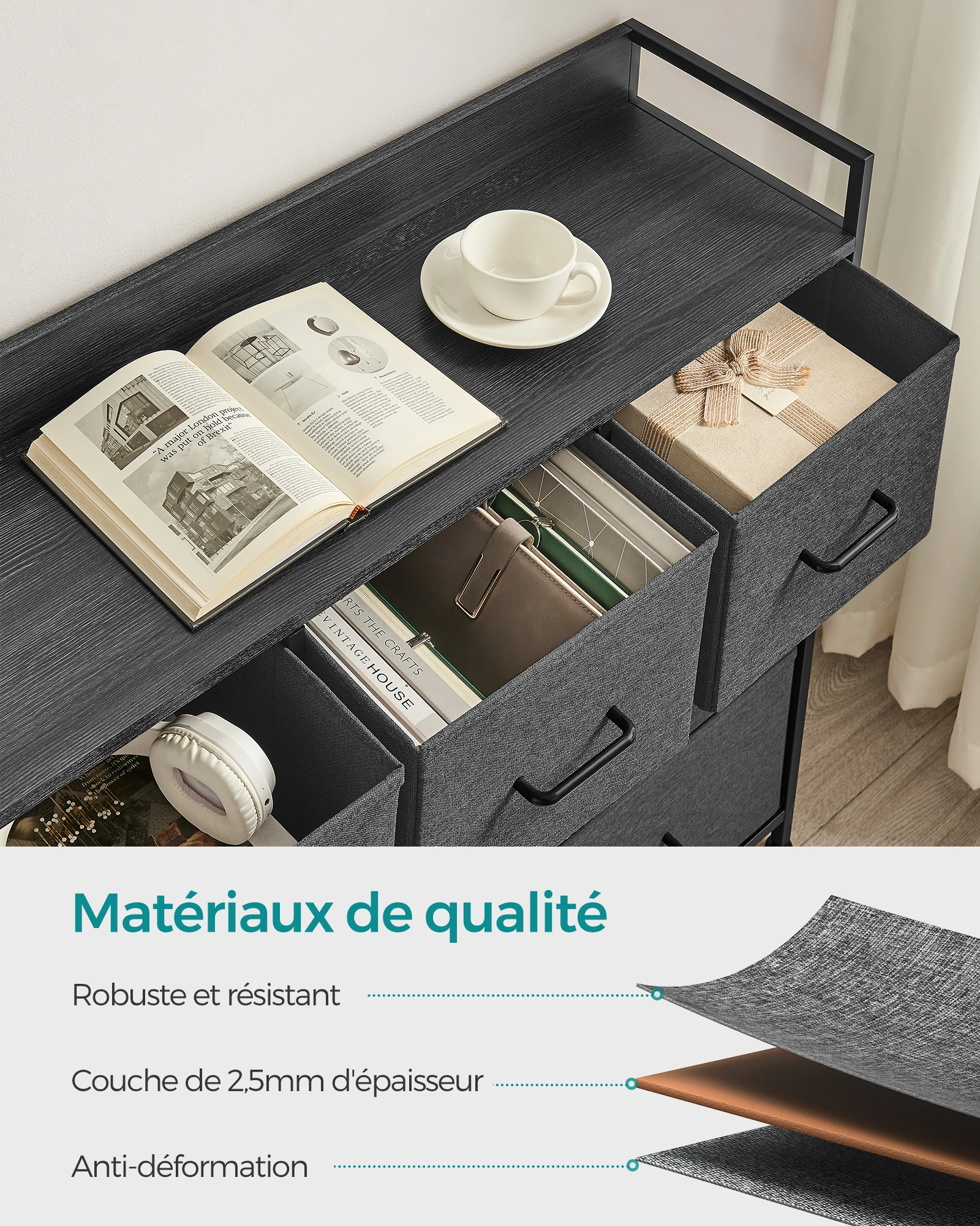 - Matériaux : Dessus en panneau d’aggloméré, acier, façades de tiroirs en tissu
