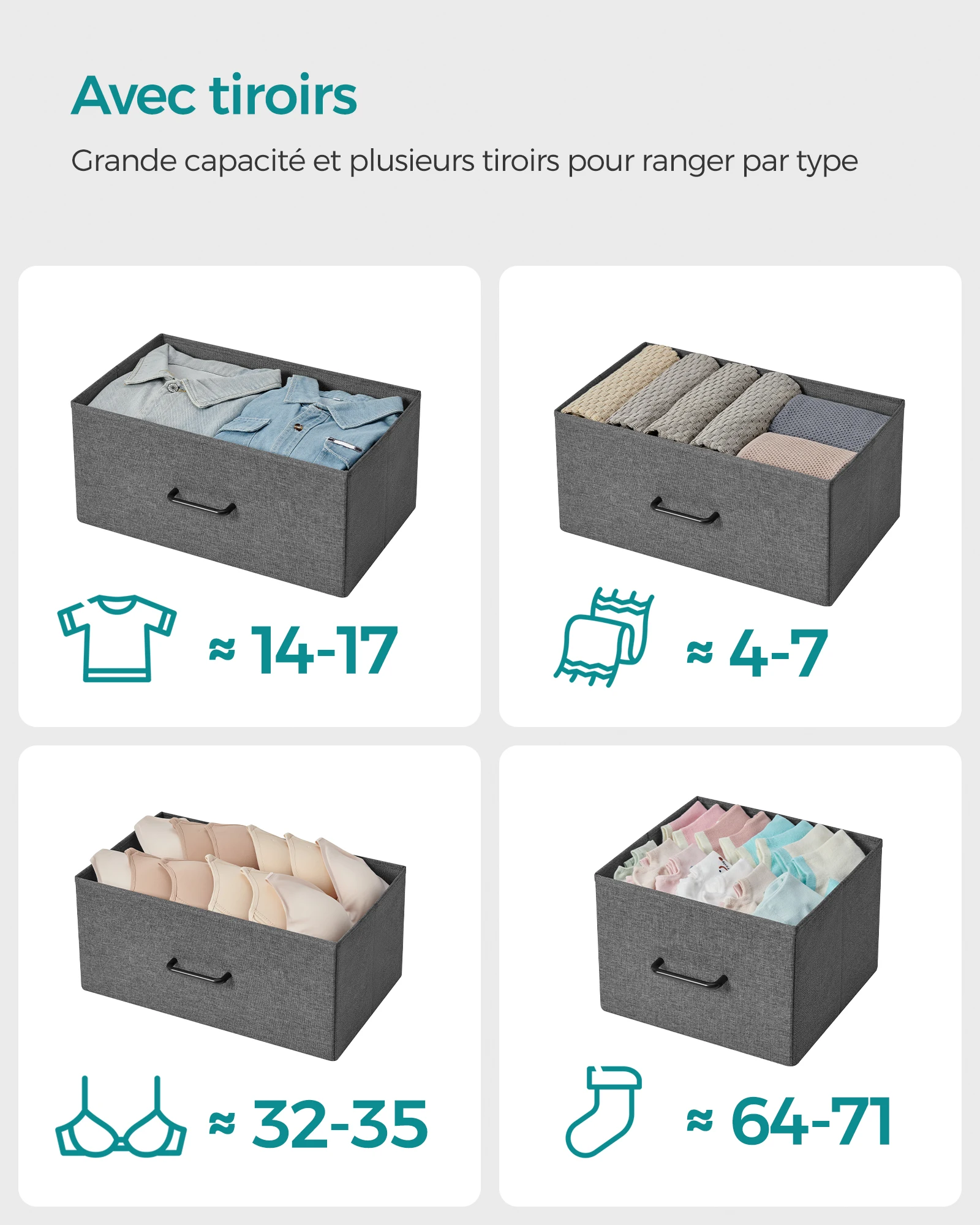 - Rangement Polyvalent : Avec 7 tiroirs (4 grands et 3 petits), cette commode permet de trier et ranger vos affaires par catégorie. Chaque grand tiroir peut accueillir 60-70 chaussures, 13-16 T-shirts ou 7-11 pantalons, tandis que chaque petit tiroir peut contenir 40-45 chaussures, 9-10 T-shirts ou 4-7 pantalons.